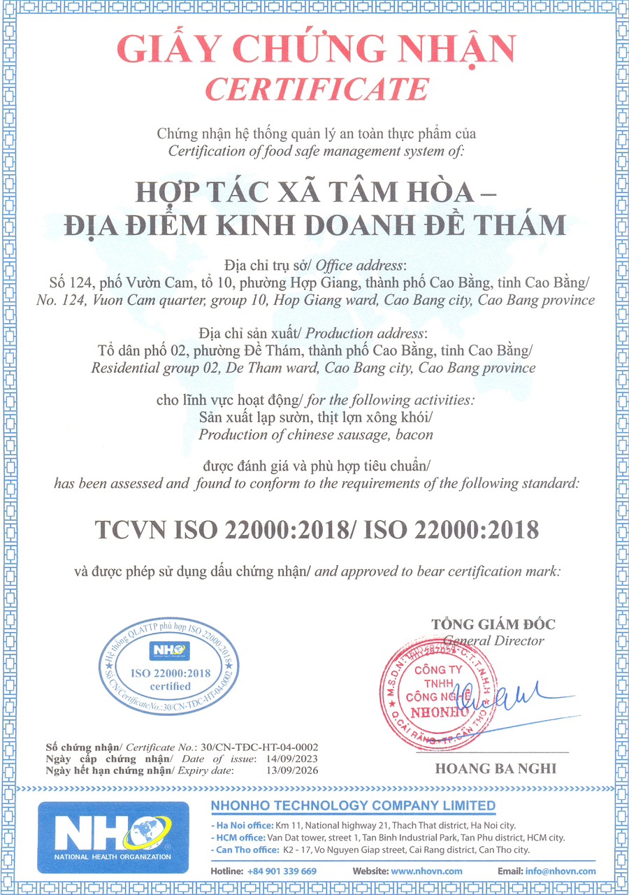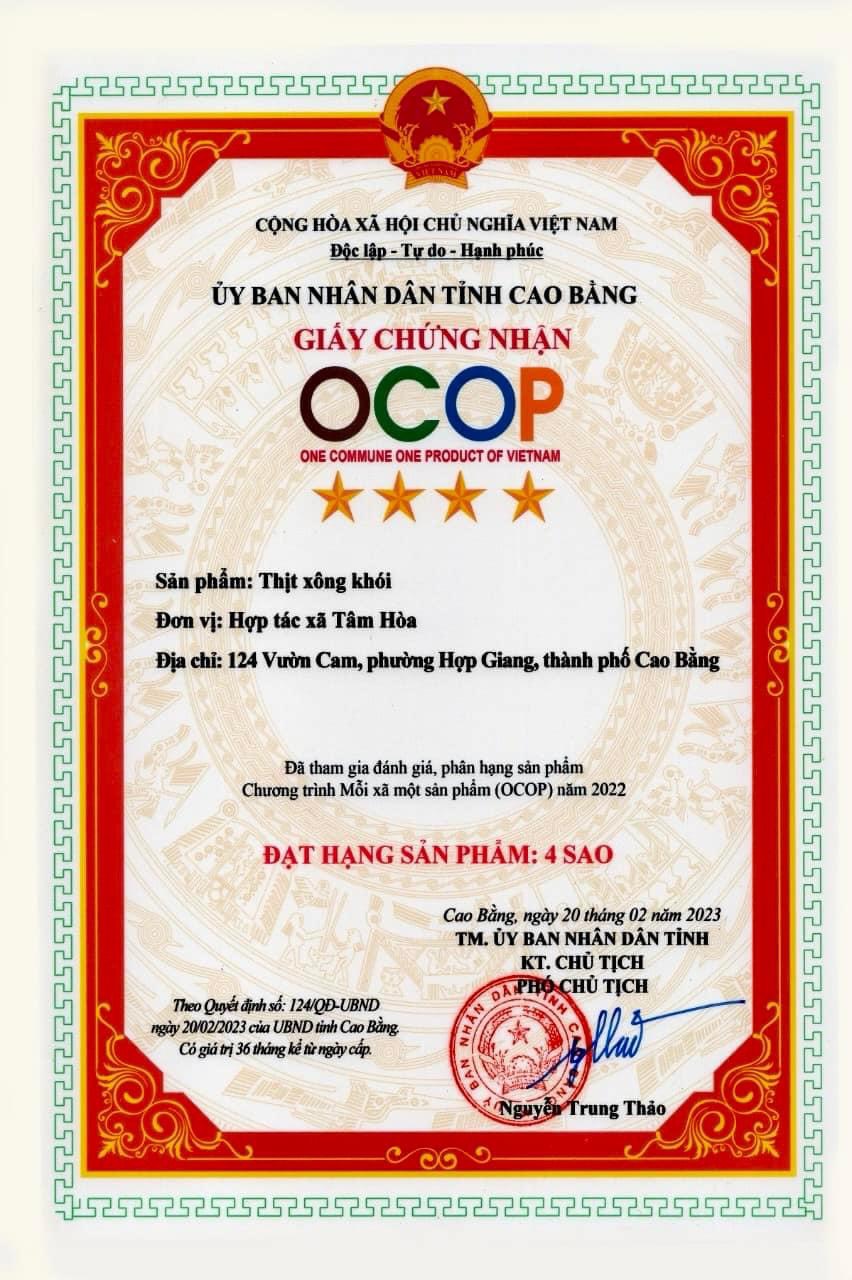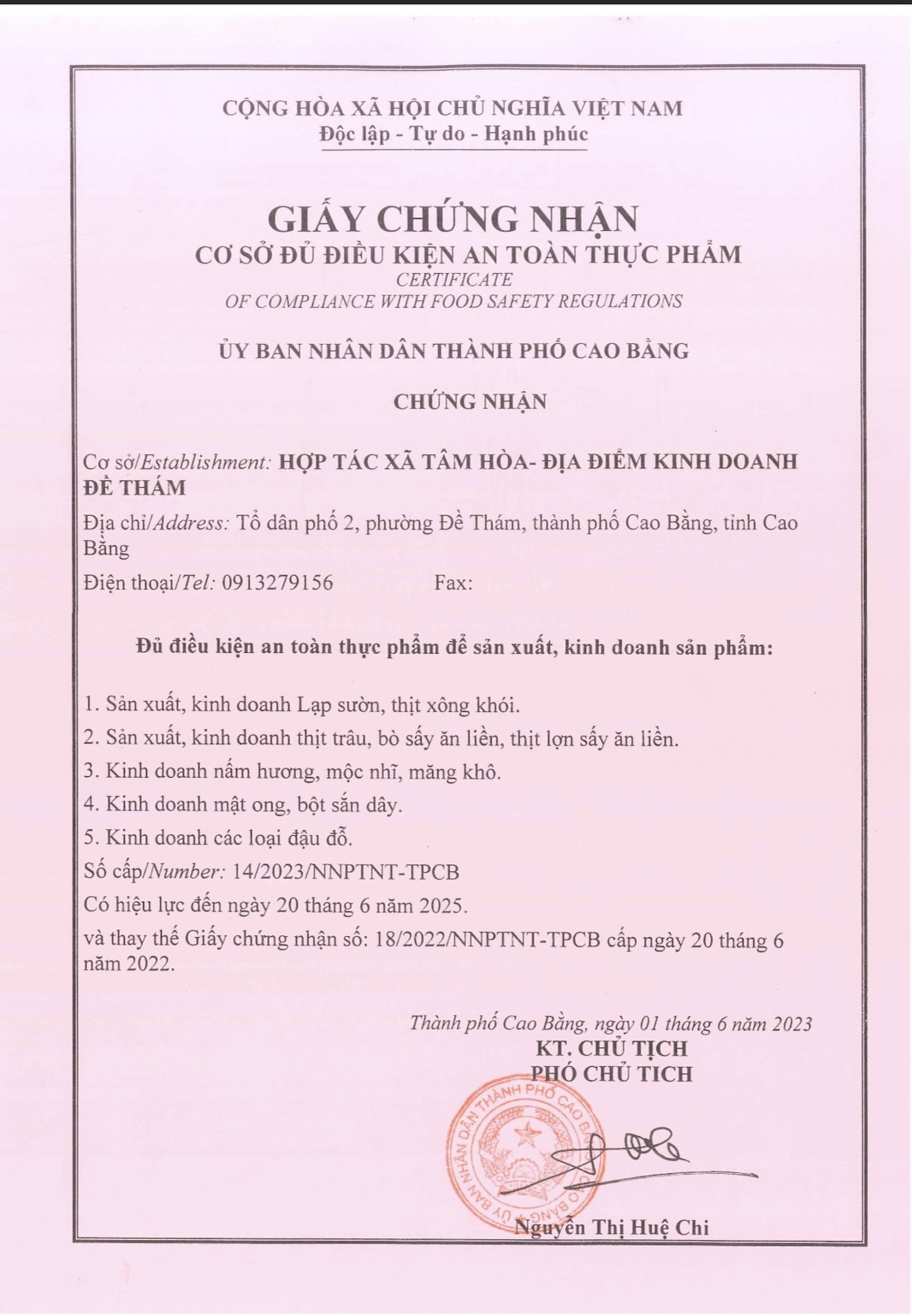 Toàn bộ sản phẩm của Tâm Hòa được sản xuất trên dây chuyền, máy móc thiết bị hiện đại, đảm bảo chất lượng và vệ sinh an toàn thực phẩm. Đặc biệt, sản phẩm của HTX Tâm Hòa tuyệt đối không sử dụng chất bảo quản thực vật, hóa chất bảo quản và là đơn vị duy nhất tại tỉnh Cao Bằng được Tổng cục tiêu chuẩn đo lường chất lượng Việt Nam cấp chứng nhận mã số mã vạch sản phẩm… Năm 2021, sản phẩm Lạp sườn, Thịt xông khói mang thương hiệu HTX Tâm Hòa được bình chọn là sản phẩm CNNT tiêu biểu cấp quốc gia do Bộ Công Thương công nhận và bình chọn.